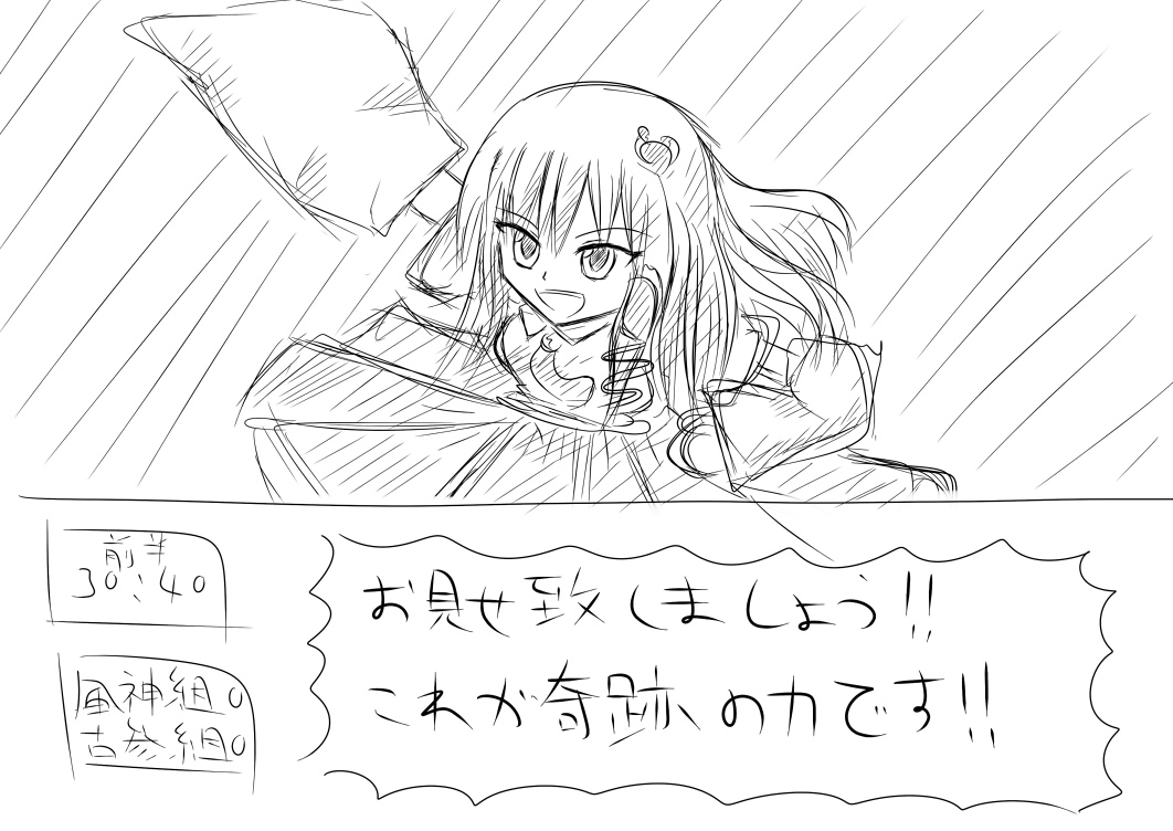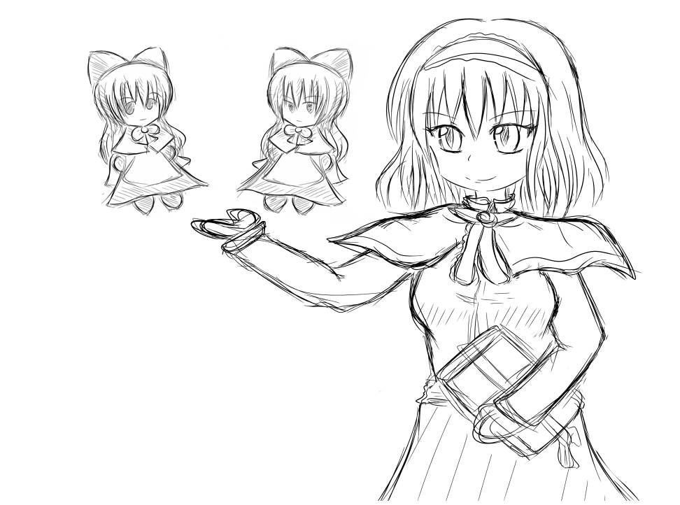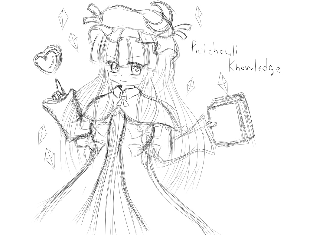 でも、私は何時も通り同人ショップで東方のアレンジCDを買ってました。 正直、もう5枚くらいで十分になってしまいました、流石にもうついてけないよママン。 いや、お金に余裕があれば100枚でも200枚でも欲しいですが、もはや聴き切れないって問題が。 今でも冬コミで買ったCDでまだ封開けてないのが10枚ぐらい残ってるのに・・・ 知らないサークルさんも更に増えてきており、今ではインストアレンジCD探す方が難しくなってきてますね。 そういえば、例大祭では噂ではちゃんと並んでいた列が待機したまま忘れられて ペナルティ組よりも入場が遅くなったとか・・・これが本当ならば流石に酷いぜ運営さん。 とはいえ、あれだけの人数を裁くのは確かに至難の業・・・難しい問題なんでしょうねぇ。 あ、今週は例大祭だったのもあり、心がそっちに行ってしまってたので 色付きのイラストは完成出来なかったです。 一応落書き自体はしてたんですが・・・ 東方サッカー妄想伝(早苗) Ibより「イブとメアリー」 早苗さんの方はね、タイトル通りの妄想ですよ・・・ゲームの続編が出ないのならば もう妄想するしかないじゃないですか・・・っ!! Ibの方は何かそれっぽいイラストを描こうとして失敗してる感じがありますね。 一応Ibの方の絵はペン入れしてちゃんと色塗りまで完成させるつもりです。 前の記事で毎日落描きを描くと言ったな、ありゃ嘘だ(ぇ いや、リアル仕事が忙しくて、それにモバマスも忙しくて・・・ね? せめて一週間に1枚色の着いたイラストを・・・という約束だけ守ろうと思います。 土日という纏まった時間が取れた時が一番絵を書く環境を整え易いんですよね。 毎日が休みだったら良いのに(切実) という訳で今日はぱっちゅさんを描いて見ました。 ラフ 線画 ラフは実は4月頃すでに描いてたんですが、ペン入れする時間が中々取れなかったので 折角だからこの絵を完成させるかと思い、ちまちまと作業を開始しました。 ペン入れまではね・・・まぁスムーズに進むんですよ。(時間は掛かるけど) 完成 色塗りが・・・色塗りが本当苦戦します、私の悪い癖なんですけど 塗ってて疲れて来たら「もぅこんなもんで良いだろう」と諦めが入る。 それじゃ駄目だと分かりつつも今日に至るという感じでしょうか・・・ この先に進む為には妥協せずしっかりとイラストを完成させる事が必要なんでしょうね。 実はパチュリーさんを描くのは2年振りでした。 2年前の絵 2年前と比べると流石に絵が変化してますね、でも描き方とかは殆ど変わってないです。 私は絵を描く時にはSAI使ってるんですけど、鉛筆ツールを今まで全く使わなかったです(爆) 最近ようやくまともに使い始めたんですけど、使い易いね!鉛筆ツール! というか、SAI使い出して4年ぐらい経つ人間のセリフじゃあないですね、本当orz